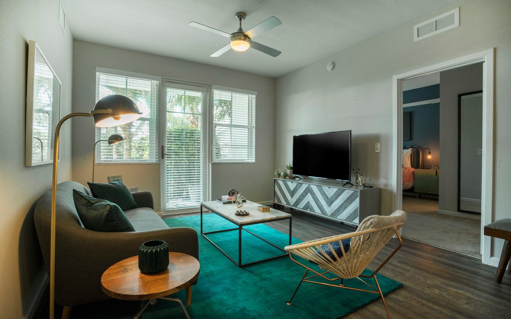 Luxury apartments with energy-efficient appliances, detailed finishes, plank flooring, in-unit washer/dryer, walk-in closet, and more all in a modern, top-of-the-line unit.